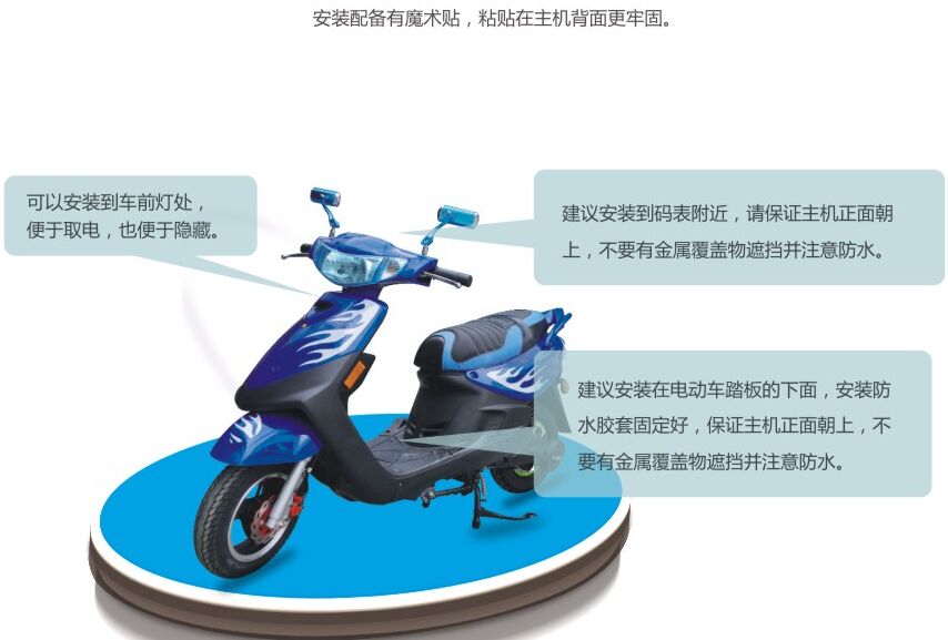 主要應(yīng)用于摩托車(chē)、電動(dòng)車(chē)、電瓶車(chē)的實(shí)時(shí)監(jiān)控、行程記錄、軌跡回放、警報(bào)提醒、車(chē)輛信息管理等。