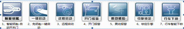 5、警戒中鎖油路功能:進(jìn)入防盜狀態(tài)后,車輛自動(dòng)切斷油路或電路系統(tǒng),在順利通過智能鑰匙唯一識(shí)別驗(yàn)證后,系統(tǒng)自動(dòng)恢復(fù);如果沒有通過智能鑰匙驗(yàn)證,系統(tǒng)仍處于防盜狀態(tài),這時(shí)即使非法強(qiáng)制性進(jìn)入車內(nèi),此時(shí)發(fā)出聲光報(bào)警,防盜功能處于工作狀態(tài);