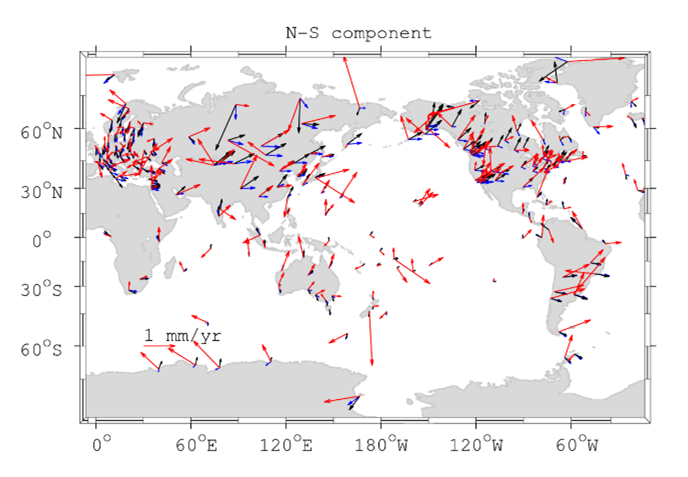 藍色箭頭:地表質量重新分布對GPS臺站水平南北向位移的影響;黑色箭頭:地表質量重新分布與熱膨脹形變對GPS臺站水平南北向位移的影響;紅色箭頭:GPS臺站水平南北向位移的周年形變。不難看出,黑色箭頭與紅色箭頭的吻合程度比藍色箭頭與紅色箭頭的吻合程度更高,即考慮由溫度變化引起的熱膨脹形變之后,更能重構觀測上GPS臺站水平向位移。