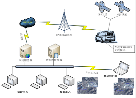 工作原理:每一輛車都裝有GPS接收機和通信電臺,監(jiān)控中心設在基準站位置,坐標精確已知。基準點上安置GPS接收機,同時安裝通信電臺、計算機、電子地圖、大屏幕顯示器等設備。工作時,各車輛上的GPS接收機將其位置、時間和車輛編號等信息一同發(fā)送到監(jiān)控中心。監(jiān)控中心將車輛位置與基準站GPS定位結果進行差分求出差分改正數(shù),對車輛位置進行改正, 計算出精確坐標,經(jīng)過坐標轉換后,顯示在大屏幕上。